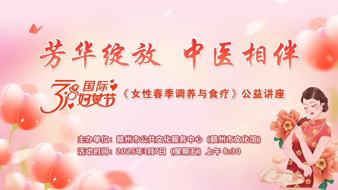在这个春意融融的三月,为庆祝"三八"国际妇女节,赣州市文化馆携手济世堂国医馆开展了一场别开生面的公益活动——《女性春季调养与食疗》。活动不仅为女性朋友们送上特别的节日礼物,更通过春季健康调养与食疗知识的传播,为城市增添了一抹温情印记。