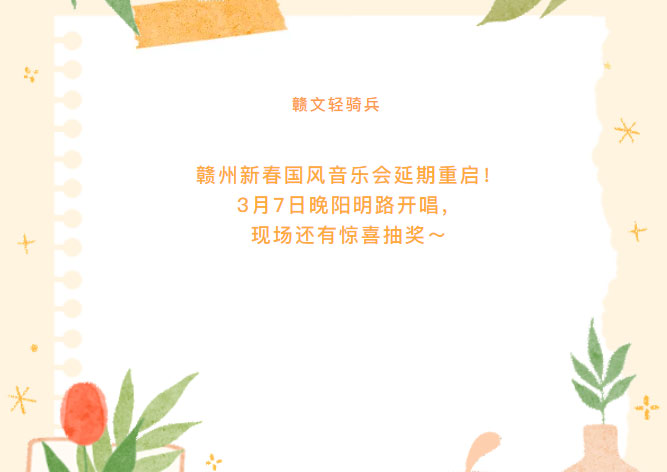 赣文轻骑兵|赣州新春国风音乐会延期重启!3月7日晚阳明路开唱,现场还有惊喜抽奖~