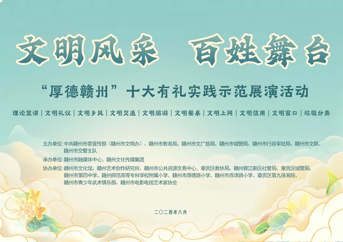 由中共赣州市委宣传部(赣州市文明办)、赣州市教育局、赣州市文广旅局、赣州市城管局、赣州市行政审批局、赣州市文联、赣州市交警支队主办,赣州市融媒体中心、赣州文化传媒集团承办的“厚德赣州”十大有礼实践示范展演即将上演~