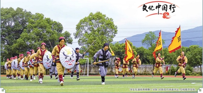 时而静若处子、气沉丹田,时而动如脱兔、刚劲有力……近日,在大余县吉村镇吉村中学的操场上,十余名学生手持圆形或燕尾形盾牌,正全神贯注地学习“开旁牌”“持牌蹉步”“埋伏偷袭”等旁牌舞动作。他们跳跃腾挪、灵巧迅猛,过程紧张激烈,颇有战场气氛。