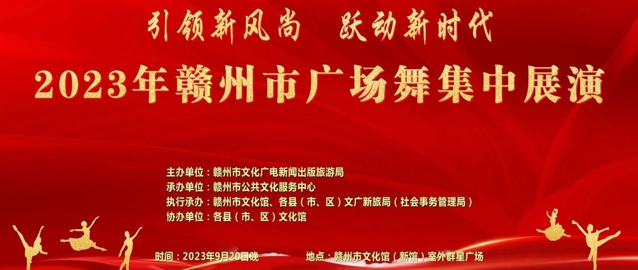 为深入学习宣传贯彻党的二十大精神,推动广场舞活动蓬勃开展,创作推广优秀广场舞作品,不断满足人民日益增长的精神文化需求,2023年赣州市广场舞集中展演将于9月20晚上19:30在赣州市文化馆(新馆)室外群星广场举行。由各相关县(市、区)文化馆选送的16支广场舞队伍将登…