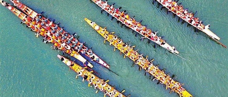 众人划浆争上游。“鼓声三下红旗开,两龙跃出浮水来。棹影斡波飞万剑,鼓声劈浪鸣千雷。鼓声渐急标将近,两龙望标目如瞬。坡上人呼霹雳惊,竿头彩挂虹蜺晕……”端午期间,龙舟竞渡热腾客乡赣南,河面上水花四溅鼓声阵阵,竞渡龙舟如离弦之箭劈波斩浪疾速前进,一江两岸围…