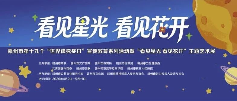 4月2日至5月11日,“看见星光 看见花开”主题艺术展将在赣州市文化馆一楼展厅温情开展。本次展览由市残联、市教育局、市民政局、市文广旅局、市卫生健康委、团市委、市妇联共同主办,市公共文化服务中心、赣州市文化馆与市精神残疾人及亲友协会承办。