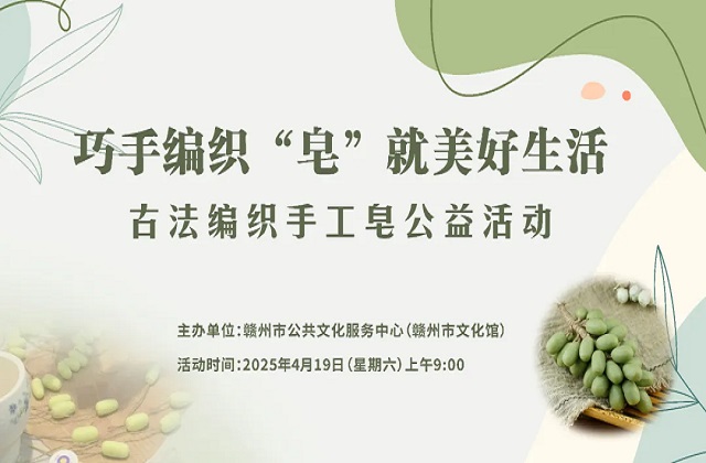 在春意盎然的 4 月,古法编织手工皂公益活动在赣州市文化馆一楼文化驿站温暖落幕。这场以“巧手编织‘皂’就美好生活”为主题的古法编织手工皂活动,吸引了众多市民的热情参与。大家在这个充满创意与匠心的上午,共同编织出了生活的诗意与美好。