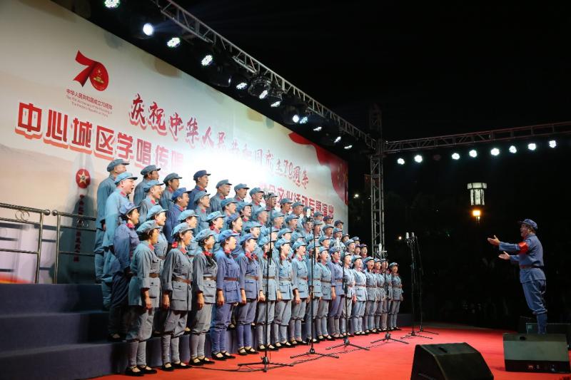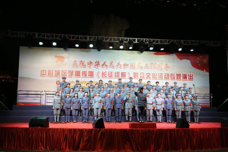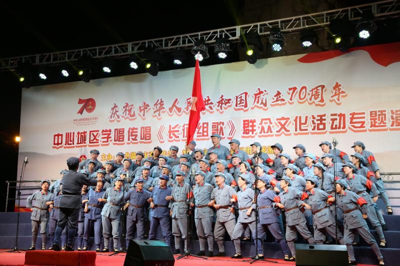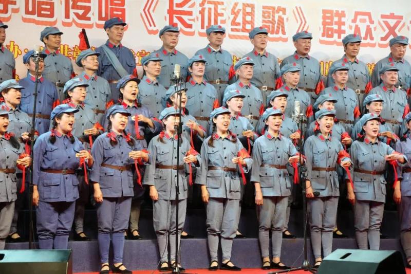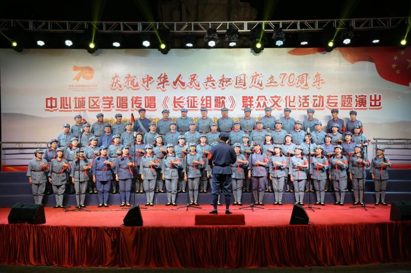 当晚七点半,“庆祝中华人民共和国成立70周年”中心城区学唱传唱《长征组歌》群众文化活动专题演出活动在赣县区灌婴广场正式开始,由赣州市文化馆红梅合唱团和虔州合唱团精彩呈现的完整版《长征组歌》在这里唱响。近两百名文化志愿者倾情献唱,以《长征组歌》为名,齐颂国恩。《长征组歌》颂扬了中国革命史中具有传奇色彩的两万五千里长征,主题鲜明、形式新颖、风格独特,是被誉为我国合唱史上具有里程碑意义的重要作品,一直以极高的艺术价值和传唱度为人们所称道。