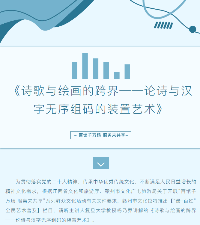 ※ 特别声明:本公众号仅用于赣州市文化馆公共文化服务及群众文化艺术普及,不用于任何商业用途。所转载文章及图片、视频、音频等版权均属原作者。如有侵权,请及时与本公众号联系。