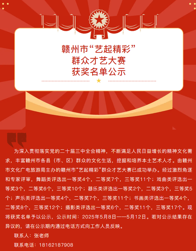 ※ 特别声明:本公众号仅用于赣州市文化馆公共文化服务及群众文化艺术普及,不用于任何商业用途。所转载文章及图片、视频、音频等版权均属原作者。如有侵权,请及时与本公众号联系。