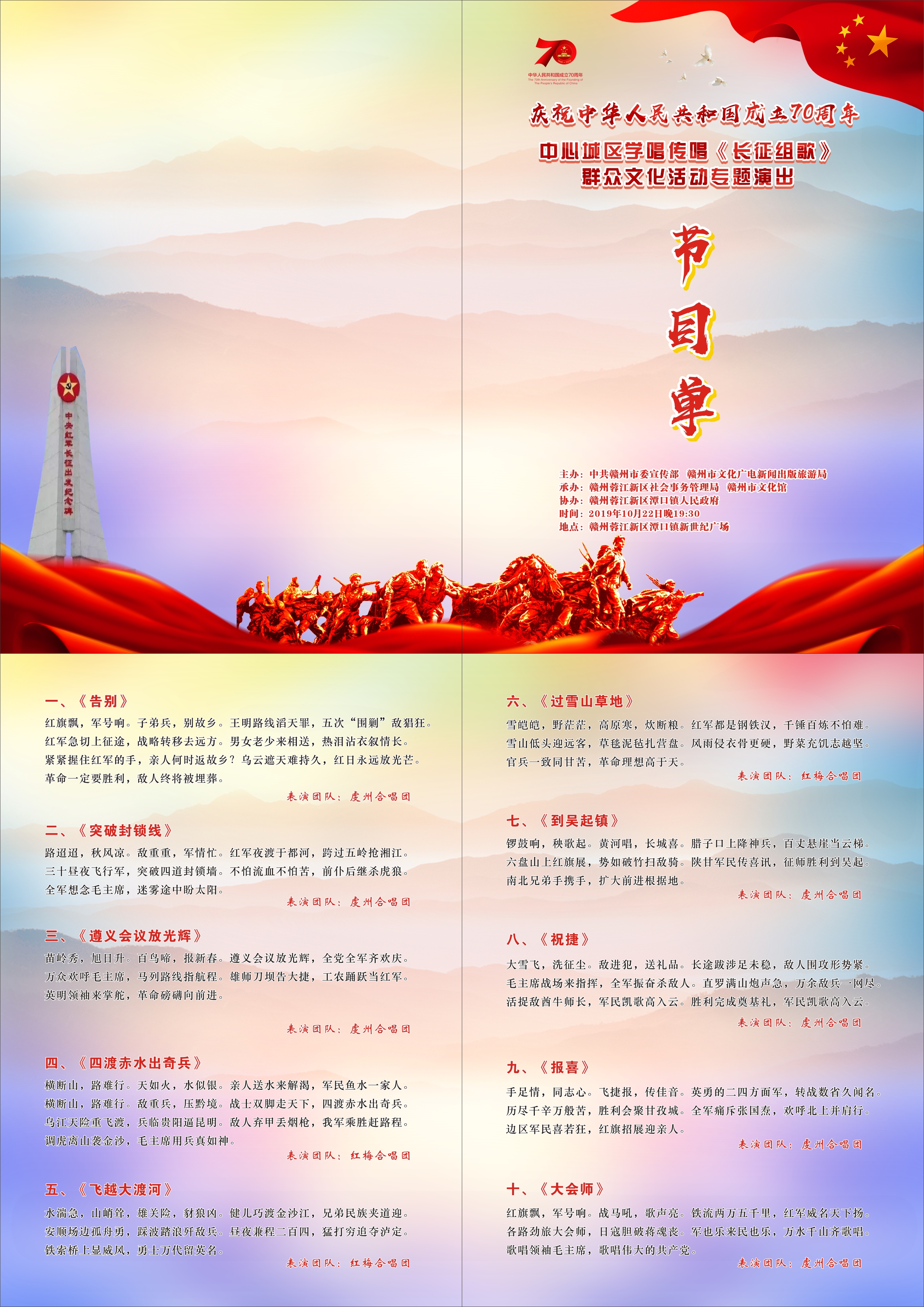 为深入贯彻落实习近平新时代中国特色社会主义思想和党的十九大精神,庆祝中华人民共和国成立70周年和中国共产党成立98周年,唱响红色经典,传承红色精神,由市委宣传部、市文广新旅局主办,赣州蓉江新区社会事务管理局、市文化馆承办,赣州蓉江新区潭口镇人民政府协办的“庆祝中华人民共和国成立70周年”中心城区学唱传唱《长征组歌》群众文化活动专题演出(蓉江新区专场)将于2019年10月22日晚19:30在赣州蓉江新区潭口镇新世纪广场举行并同时进行现场直播,诚邀社会各界人士观看直播。