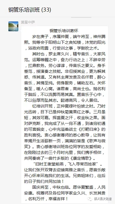 三个月的培训期间,不管是烈日炎炎还是倾盆大雨,都无法阻止学员们高涨的学习热情。坚持参加培训,刻苦练习,学员们学会了3首音阶练习曲、3首琶音练习曲、2首吐音练习曲、2首和声节奏练习曲、《歌声与微笑》、《打靶归来》、《康定情歌》3首铜管乐合奏曲,掌握了看各种调的音阶指法表,收获颇丰。