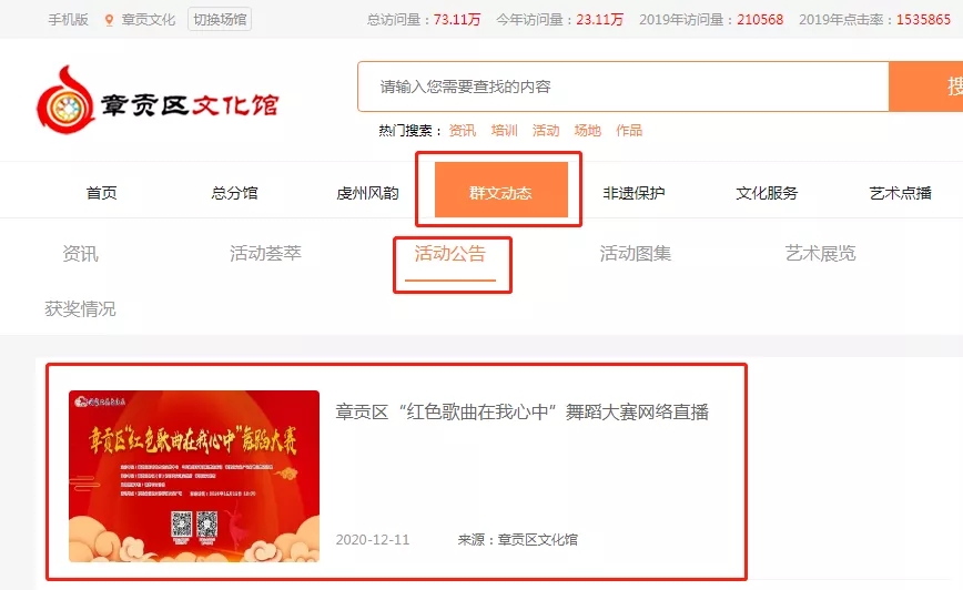 www.zgqwhg.cn章贡区文化馆网站首页→选择【群文动态】→选择【活动公告】→选择【章贡区“红色歌曲在我心中”舞蹈大赛】海报