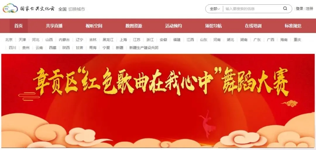 国家公共文化云网站首页→【共享直播】→选择【章贡区“红色歌曲在我心中”舞蹈大赛】海报