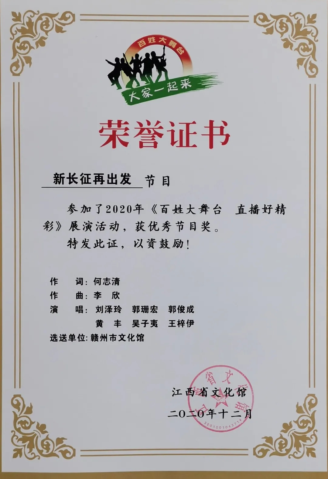 12月23日晚,在南昌群星剧场举办的“百姓大舞台 直播好精彩”江西省优秀文艺节目汇演活动在赣州市文化馆原创歌曲《新长征 再出发》激昂的音乐声中圆满落下帷幕。
