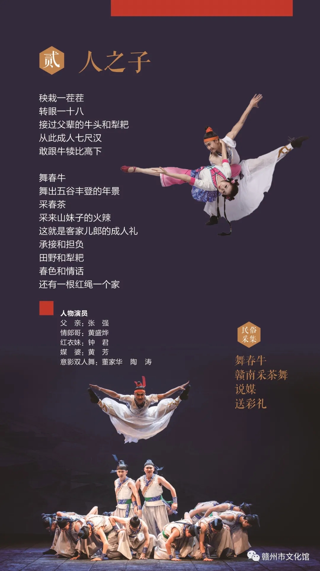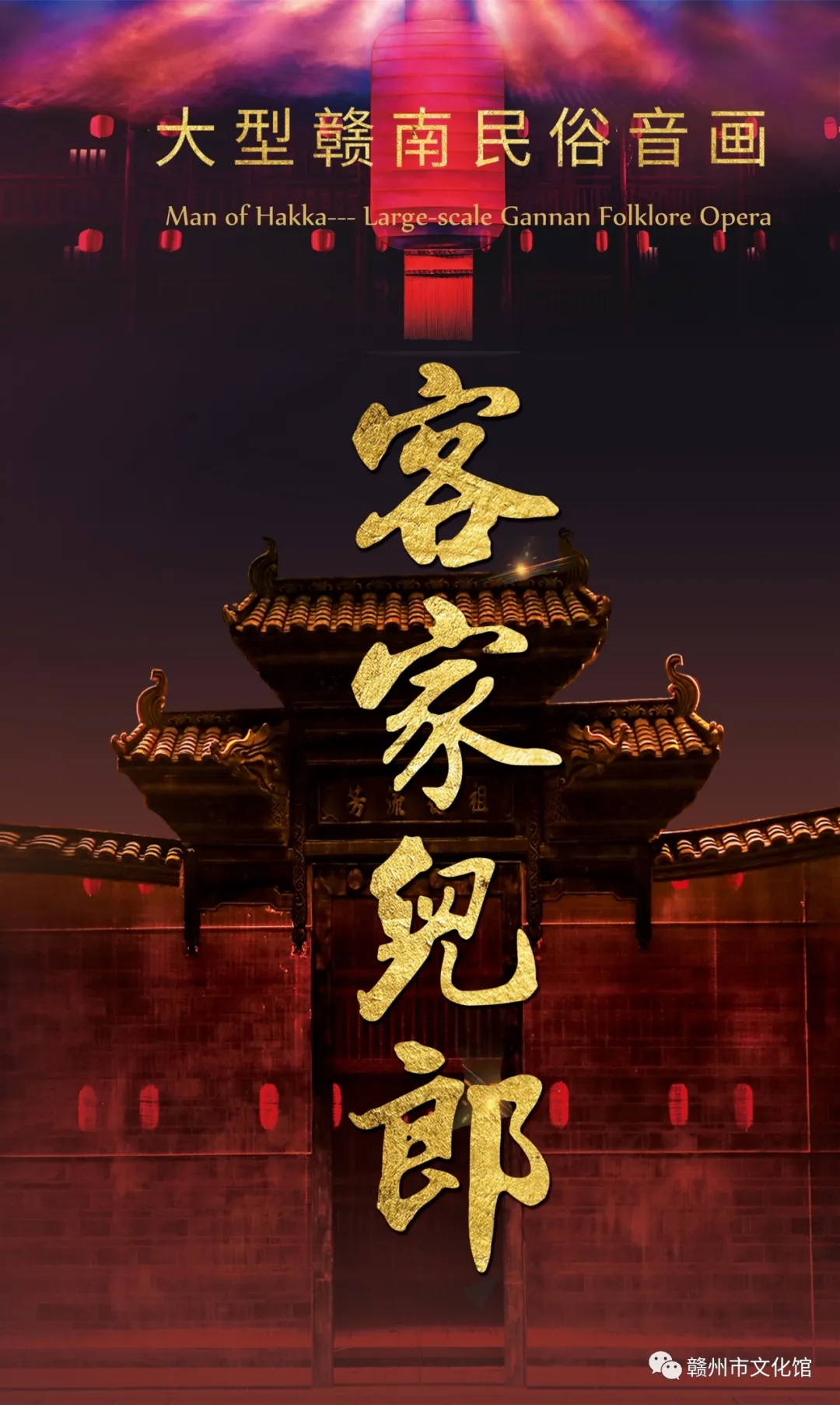 大型赣南民俗音画《客家儿郎》由江西省赣州市文化馆创作、演出。该剧以赣南客家为背景,通过对“民间仪式”“民俗民风”的采撷与提纯,将传统舞蹈、戏曲、杂技、传统音乐等多种赣南客家“非遗”艺术表现门类、几十种非遗民俗集结一体,再现客家人“耕读传家”“敬祖睦宗”“开拓进取”“兴家报国”的内在品质和价值取向,彰显“人之初”“人之子”“人之夫”“人之父”的客家风骨和男儿担当,演绎了一方地域神采、一脉民族气韵、一腔家国情怀,是赣南非物质文化遗产的一次艺术性的集中展示。该剧于2017年5月首演,曾分别入选中国国家大剧院2018年开春季演出剧目及第十四届中国(深圳)文博会艺术节优秀舞台剧(节)目展演。