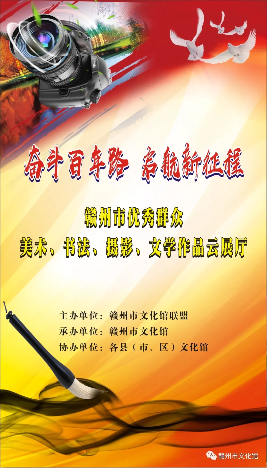 现从中择优整理编辑,美术、书法作品以“百年辉煌 继往开来”为主,摄影作品侧重于“民俗光影 幸福赣州”方面,文学类作品以“我的春节故事”为重点,通过赣南文化云网站、赣州市文化馆微信公众号进行“云展示”。我们站在“两个一百年”奋斗目标的历史交汇点上,观赏这一幅幅、一篇篇、一段段作品时,感悟到人民群众对祖国和家乡振兴发展的赞美之情,更加深刻感受到中国共产党的百年历程和伟大业绩,百年大党的梦想与追求、情怀与担当,从而勠力同心开启新时代的新征程!