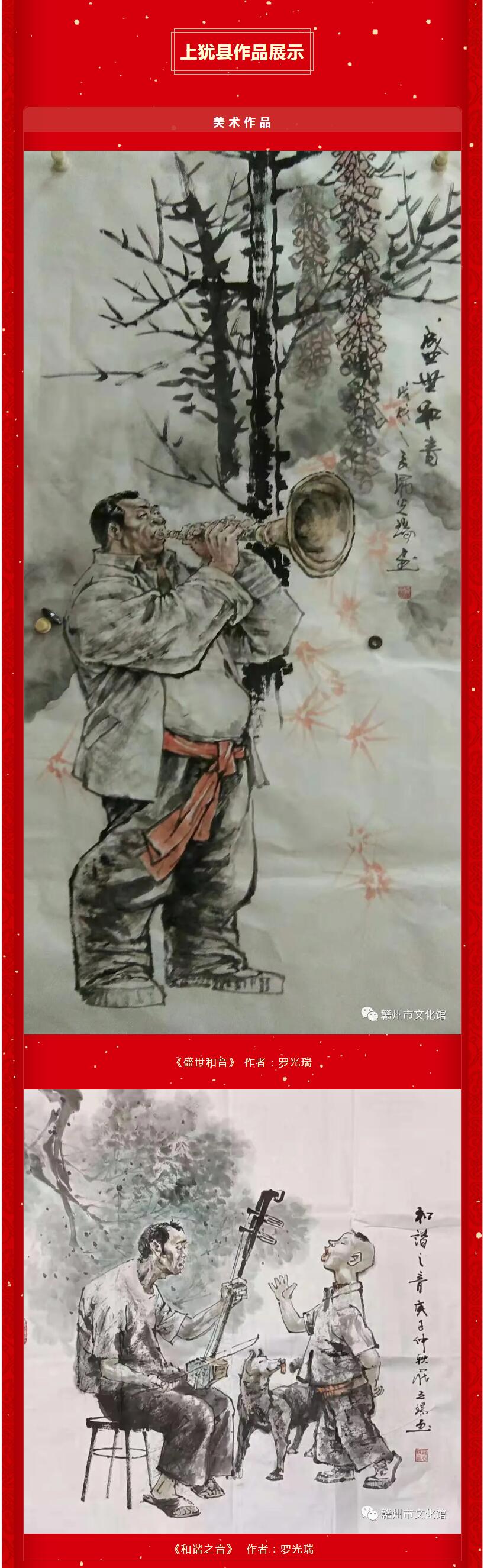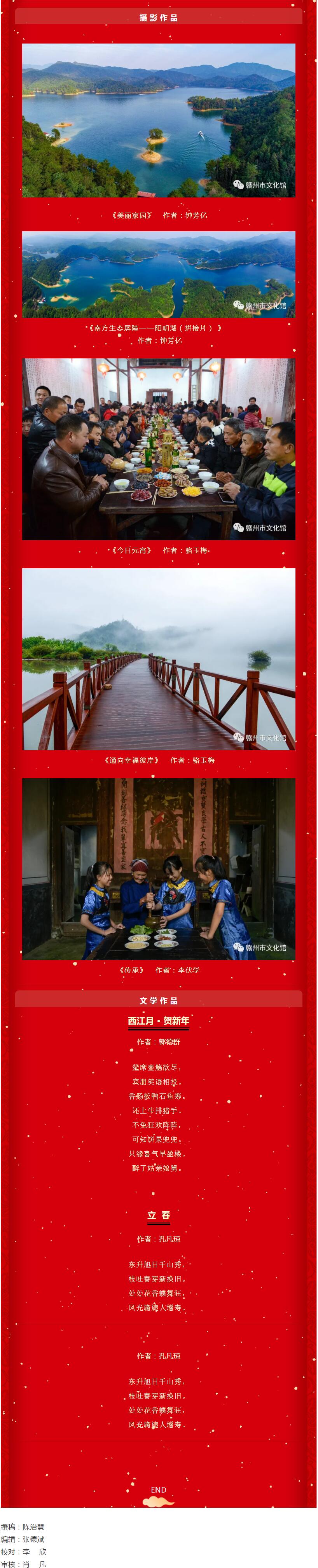 现从中择优整理编辑,美术、书法作品以“百年辉煌 继往开来”为主,摄影作品侧重于“民俗光影 幸福赣州”方面,文学类作品以“我的春节故事”为重点,通过赣南文化云网站、赣州市文化馆微信公众号进行“云展示”。我们站在“两个一百年”奋斗目标的历史交汇点上,观赏这一幅幅、一篇篇、一段段作品时,感悟到人民群众对祖国和家乡振兴发展的赞美之情,更加深刻感受到中国共产党的百年历程和伟大业绩,百年大党的梦想与追求、情怀与担当,从而勠力同心开启新时代的新征程!