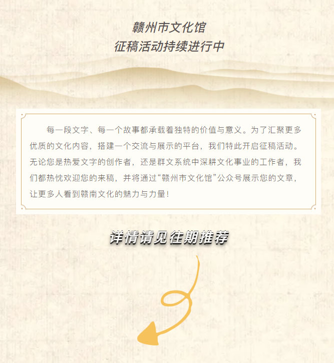※ 特别声明:本公众号仅用于赣州市文化馆公共文化服务及群众文化艺术普及,不用于任何商业用途。所转载文章及图片、视频、音频等版权均属原作者。如有侵权,请及时与本公众号联系。