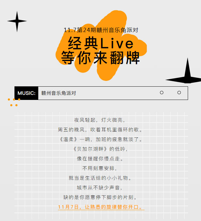 当前位置: 首页 > 文化动态 > 赣文轻骑兵 | 11.7第24期赣州音乐角派对 经典Live等你来翻牌