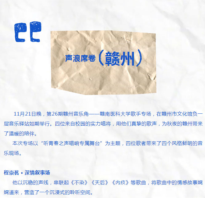 当前位置: 首页 > 文化动态 > 赣文轻骑兵 | 第26期赣州音乐角圆满落幕!声浪来袭,听青春之声,唱专属舞台