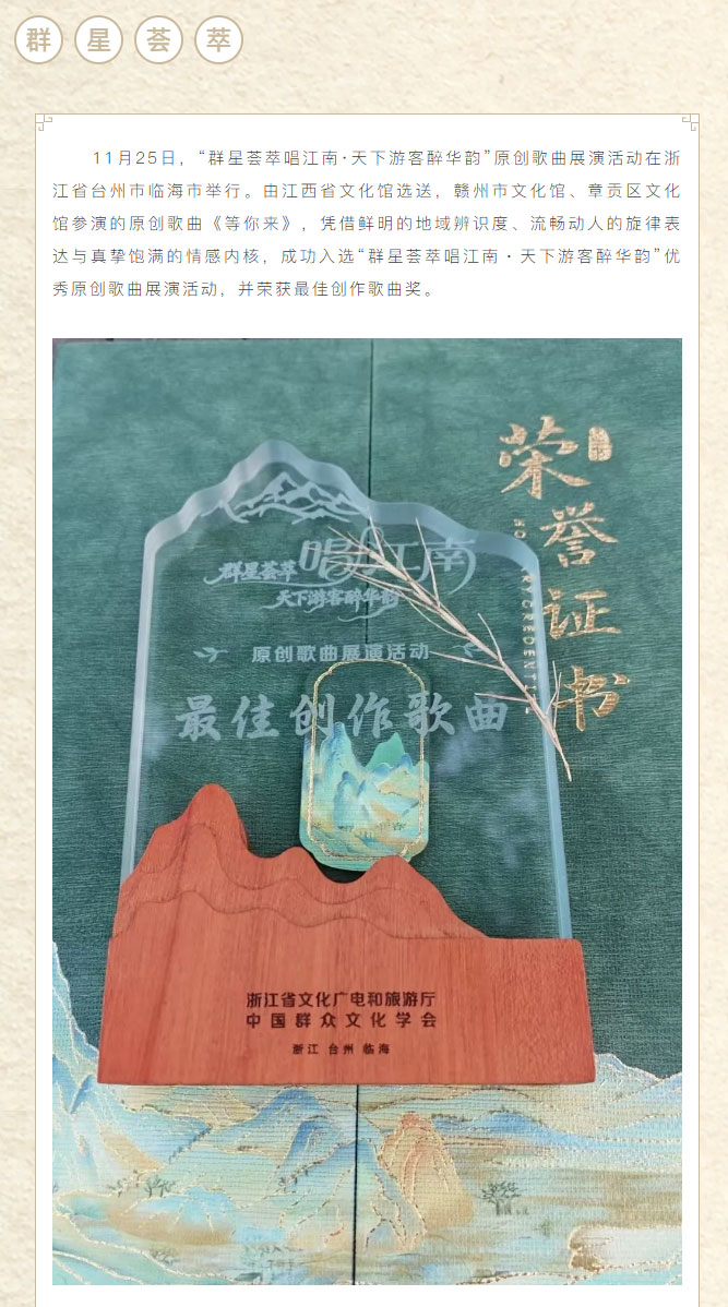 ※ 特别声明:本公众号仅用于赣州市文化馆公共文化服务及群众文化艺术普及,不用于任何商业用途。所转载文章及图片、视频、音频等版权均属原作者。如有侵权,请及时与本公众号联系。