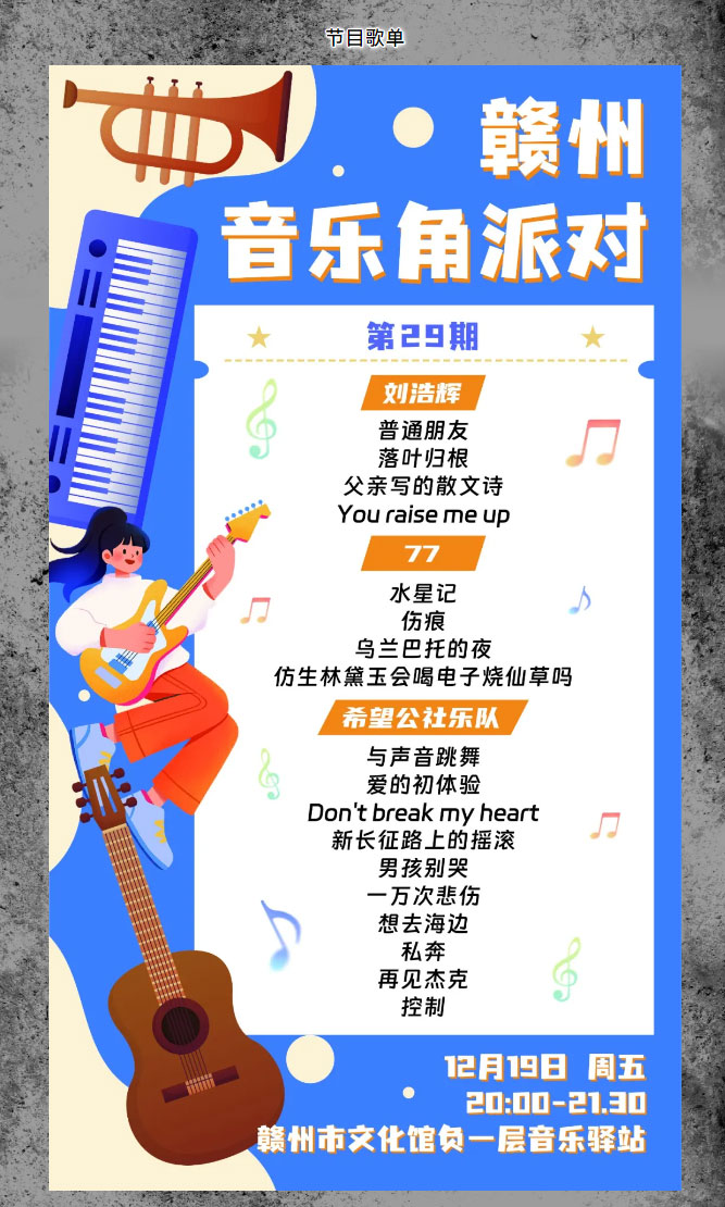 当前位置: 首页 > 文化动态 > 赣文轻骑兵 | 摇滚撞金曲,唱作皆锋芒!12.19 第29期赣州音乐角邀你共赴声色盛宴