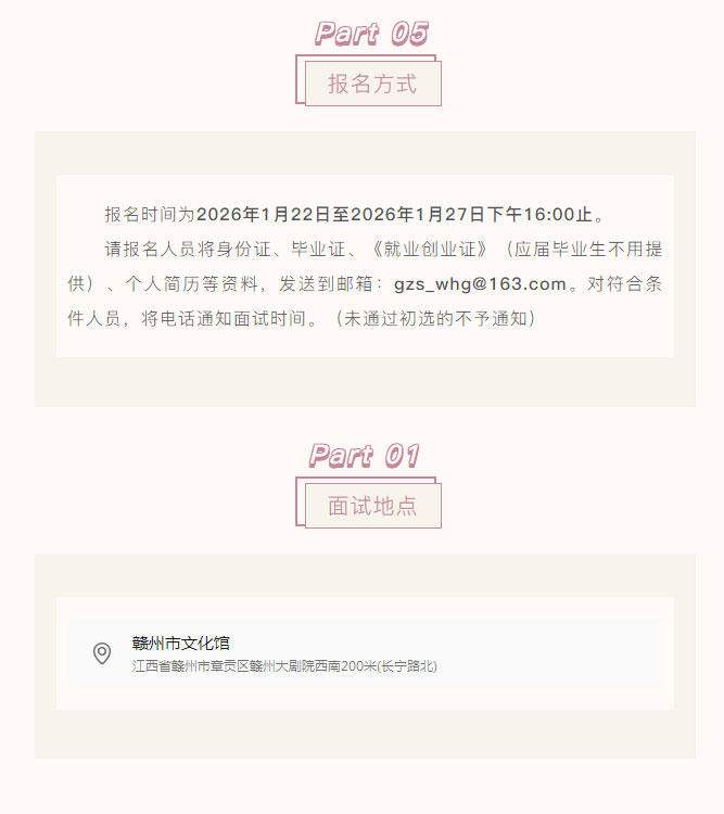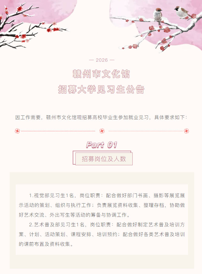 当前位置: 首页 > 文化动态 > 招募公告 | 赣州市文化馆招募大学见习生