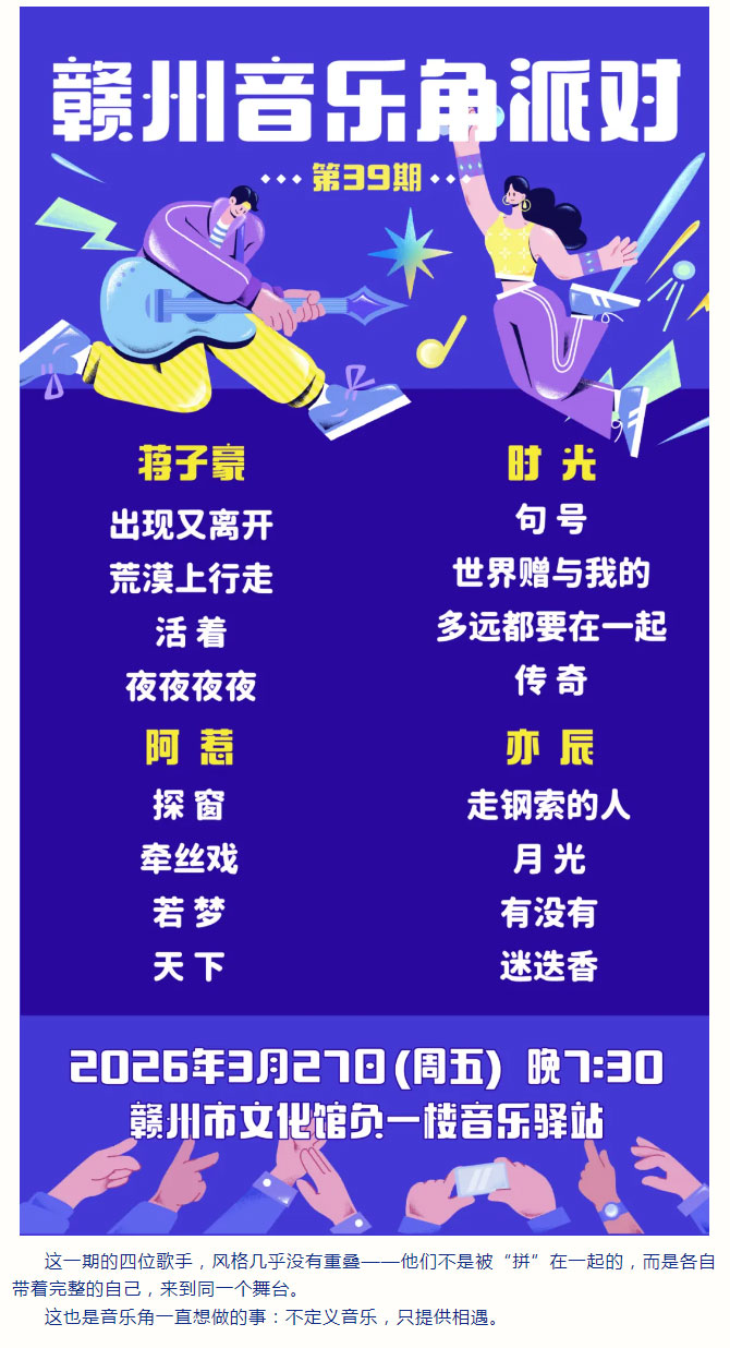 当前位置: 首页 > 文化动态 > 赣文轻骑兵 | 第39期音乐角派对,歌单已出!周五晚等你来听