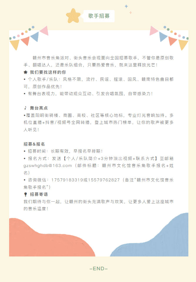 ※ 特别声明:本公众号仅用于赣州市文化馆公共文化服务及群众文化艺术普及,不用于任何商业用途。所转载文章及图片、视频、音频等版权均属原作者。如有侵权,请及时与本公众号联系。