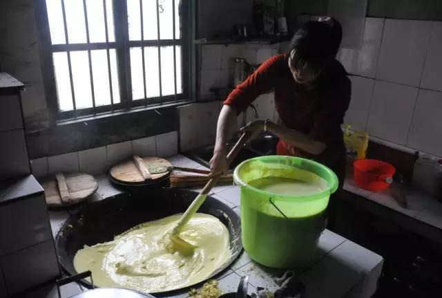 经灰水浸泡的大米,用石磨磨成磨浆,将米浆倒入锅中,温火慢慢煮,用茶树枝或者锅铲不停搅拌。