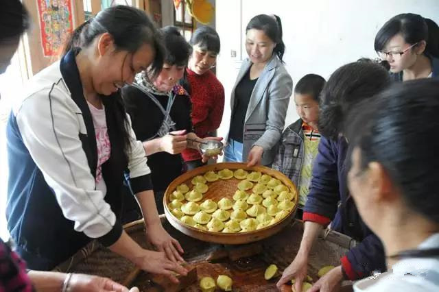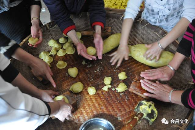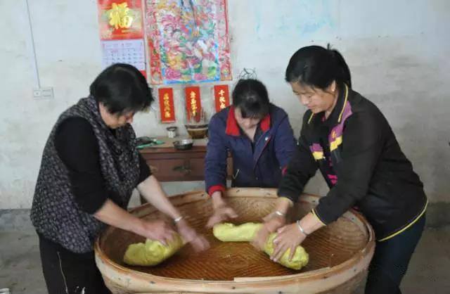 待米浆搅拌成胶状后出锅,置于大盘蓝中,妯娌们分成几团,来回揉搓。