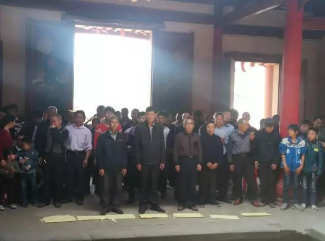各房系选出主祭、陪祭,在祠堂天井旁站立跪拜,其余宗族代表随班跪拜。