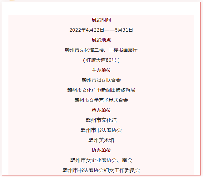 为深入贯彻落实习近平总书记中国文联十一大、中国作协十大开幕式上的讲话精神,大力弘扬传承中华民族优秀传统文化,坚定文化自信,推动我市女子书画艺术繁荣,全面展示我市女子书画艺术成就,由赣州市妇女联合会、赣州市文化广电新闻出版旅游局、赣州市文学艺术界联合会主办,赣州市文化馆、赣州市书法家协会、赣州美术馆承办,赣州市女企业家协会、商会和赣州市书法家协会妇女工作委员会协办的“巾帼翰墨 不负韶华”——赣州市首届女子书画作品展,邀请了具有一定书画创作水平及影响力的100名赣州女性书画爱好者参加此次展览,集中展示当代赣州女书画家整体水平和艺术成就。此次活动的开展将为推进我市文化的传承与发展,促进女子书画艺术的普及与提高起到积极作用。