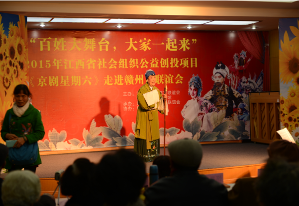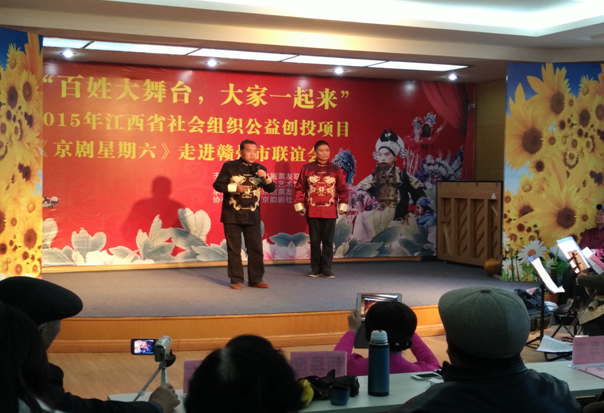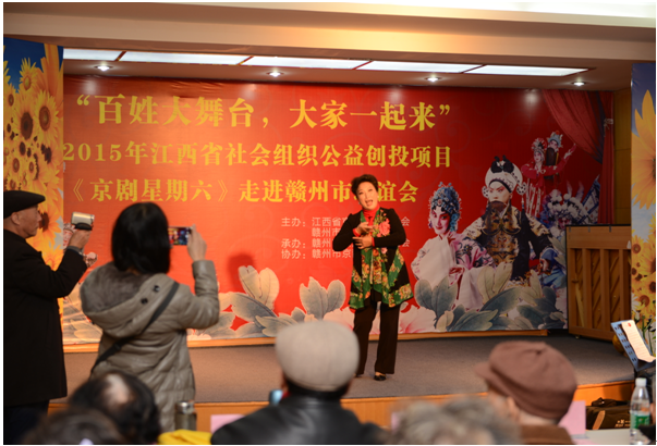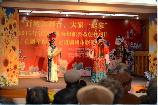 为弘扬国粹,提升我市京剧演出活力,活跃群众文化生活, 11月28日,由江西省京剧票友联谊会、赣州市群众艺术馆主办,赣州市京剧票友联谊会承办,赣州市京韵剧社协会的“百姓大舞台 大家一起来”《京剧星期六》赣州市群众艺术馆多功能厅隆重举行。本次演出的主要演员有全国京剧票友大赛“和平杯”金奖获得者尹晟嘉,银奖获得者黄华森,铜奖获得者李国芳,江西名票徐小萍、王志清,赣州市京剧界老前辈、著名演员邱慕兰、乔羽春等参与。