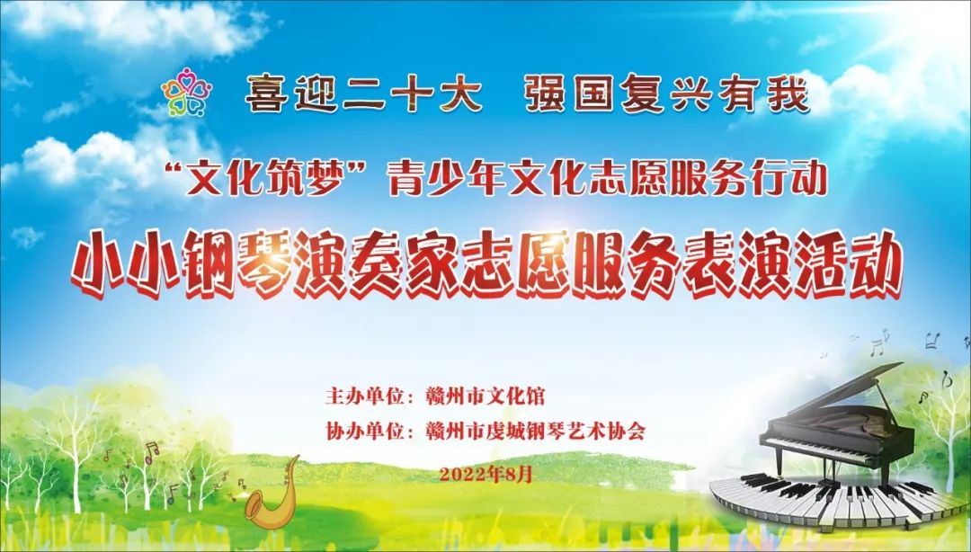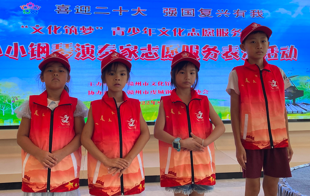 为培育青少年无私奉献、友爱互助的志愿服务精神,丰富暑期文化生活,给孩子们提供一个参加社会实践活动的快乐体验平台,赣州市文化馆招募了一批小小文化志愿者,为开展好这次“喜迎二十大 强国复兴有我”——“文化筑梦”青少年文化志愿服务行动暨“小小钢琴家”志愿表演服务助力。