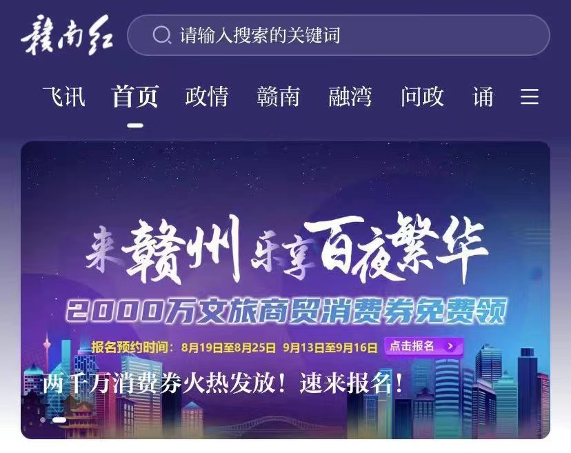 为激活文旅商贸消费潜力,积极做好“百城百夜”文旅消费季活动,促进中秋、国庆假期文旅商贸消费,赣州市文广新旅局、赣州市商务局、赣州市财政局联合印发《2022年国庆期间赣州文旅商贸电子消费券发放方案》,在全城开展“来赣州乐享百夜繁华·国庆文旅商贸消费券免费领”活动。