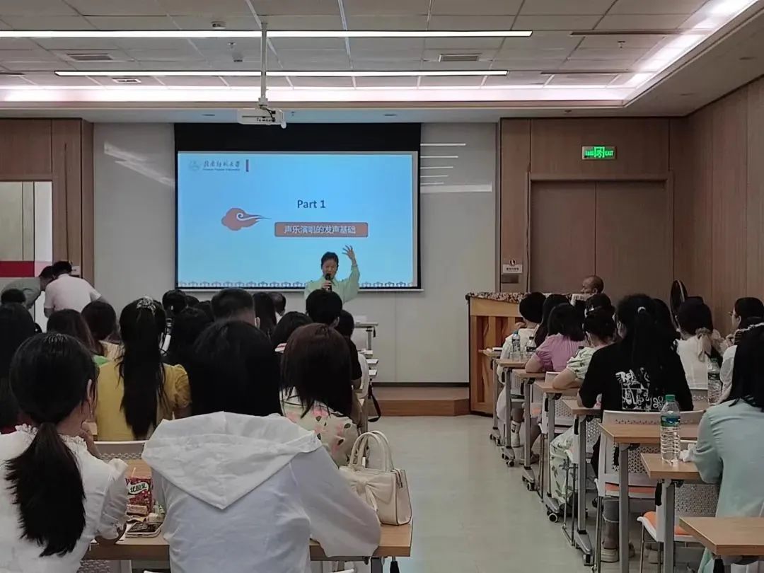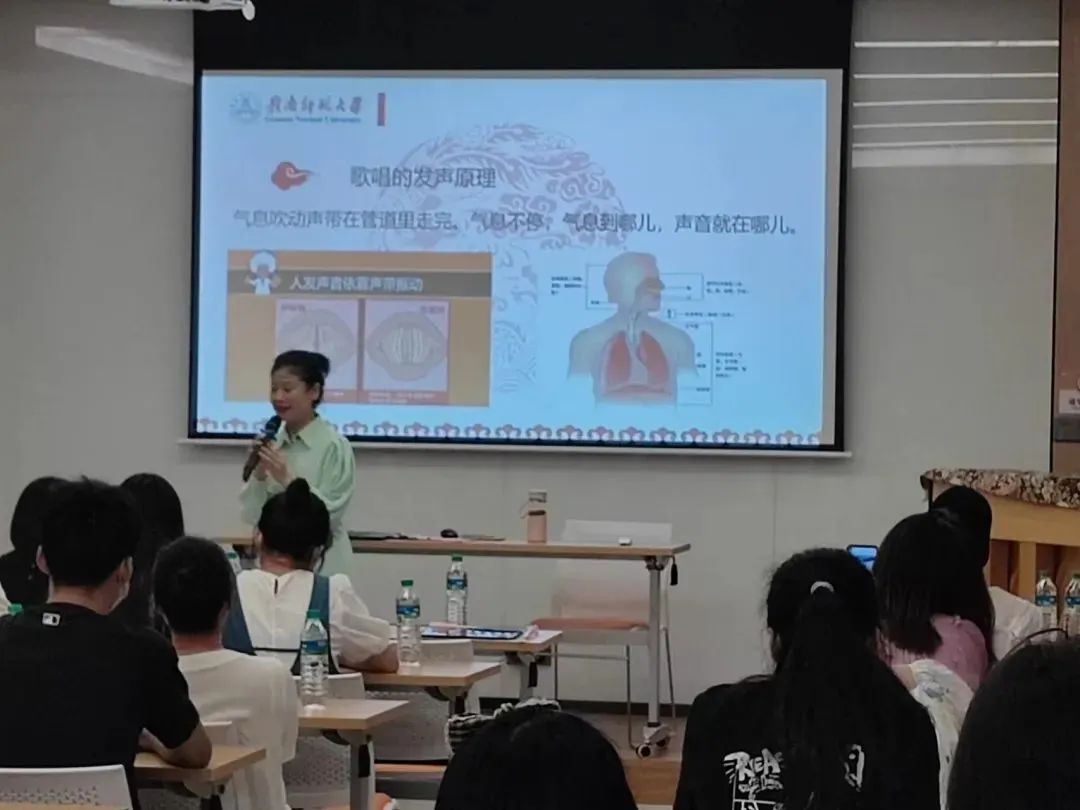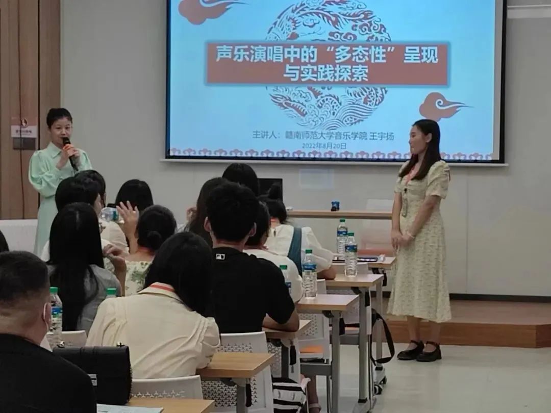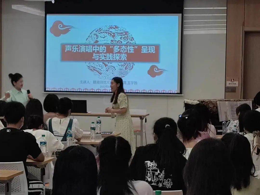 课堂上,王宇扬教授通过现场示范、现场指导和音视频范例等多种方式深入浅出的讲解了声乐的发声基础、声乐的多态呈现、声乐呈现形态与演唱实践。