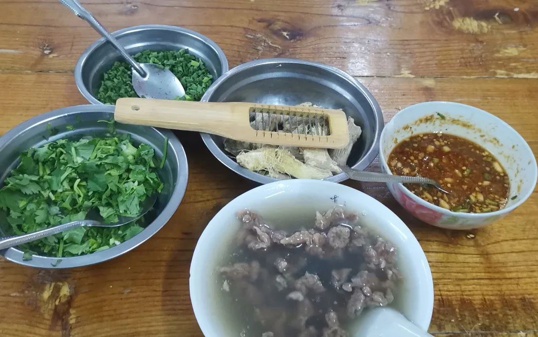 拎上肉包,找个早餐店,坐下来,从容点,早餐吃得安逸的一天是美好的,那就比如烂厅下吧。厅下虽烂,牛肉汤却有名,从瑞金打进赣州城,也有十多年了,分店也有上百家了吧。烂厅下的牛肉汤,肉丁嫩滑,汤汁浓稠,说实话,此亦平常,有特点的是桌上一块老姜一把刷子,自己动手,刷出姜末放入汤中,这姜末一放,如同化学反应一样,牛肉汤突然就赋有了灵魂,“寻常一样窗前月,才有梅花便不同”,姜末提升牛肉汤的效果大体如此,何况还有香菜葱花蒜泥辣椒助陣,这样有灵魂的牛肉汤不把吃得自己灵魂出窍,那就要问周树人老师这灵魂到底有没有了。
