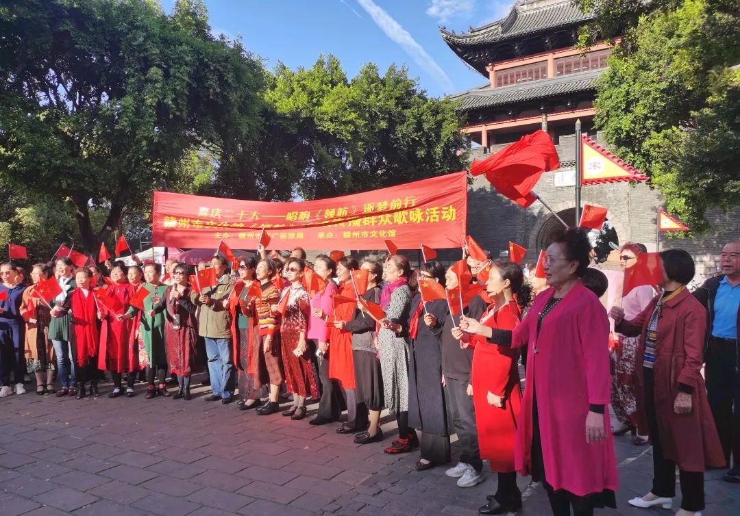 为庆祝党的二十大胜利召开,感受中国共产党为中国人民谋幸福、为中华民族谋复兴的初心和决心,讴歌中国共产党带领全国人民取得的辉煌成就,10月18日,赣州市文化馆组织广大文化志愿者来到赣州市宋城公园建春门开展红色歌曲《领航》传唱活动。