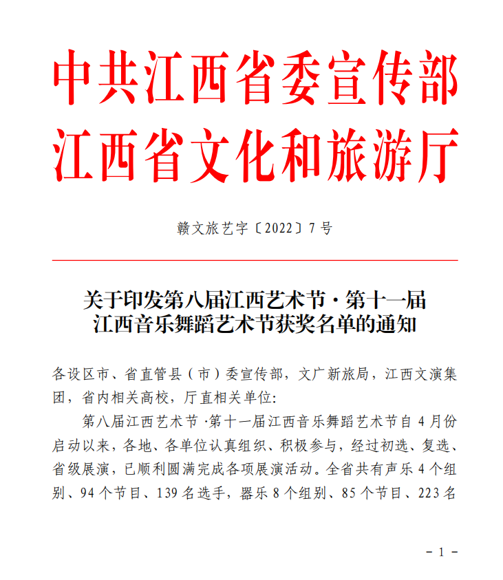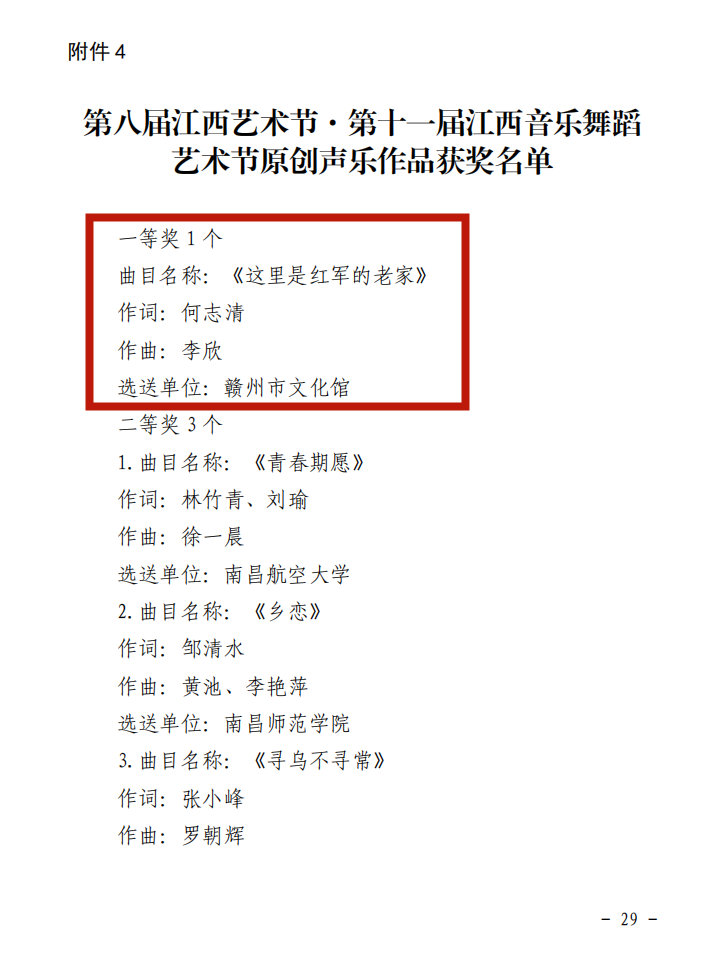 日前,第八届江西艺术节·第十一届江西音乐舞蹈艺术节获奖名单揭晓,由中共赣州市委宣传部、赣州市文化广电新闻出版旅游局出品,赣州市文化馆执行并选送的原创声乐作品《这里是红军的老家》(何志清/作词、李欣/作曲)在全省参赛作品中脱颖而出,荣获原创声乐作品一等奖(第一名)。