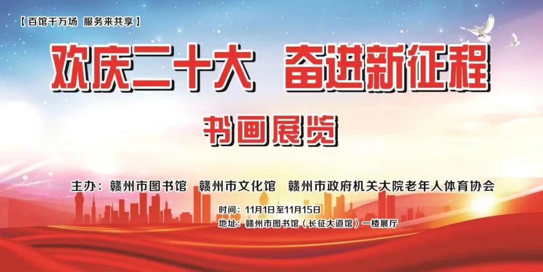 翰墨书写夕阳情,踔厉奋发实现新飞跃;丹青描绘中国梦,策马扬鞭开启新征程。为学习宣传贯彻党的二十大精神,充分激发建功新时代、奋进新征程的强烈使命担当,赣州市公共文化服务中心(图书馆) 、赣州市文化馆、赣州市政府机关大院老年人体育协会联合主办的“欢庆二十大·奋进新征程”书画展览将于11月1日在赣州市图书馆(长征大道馆)一楼展厅展出。