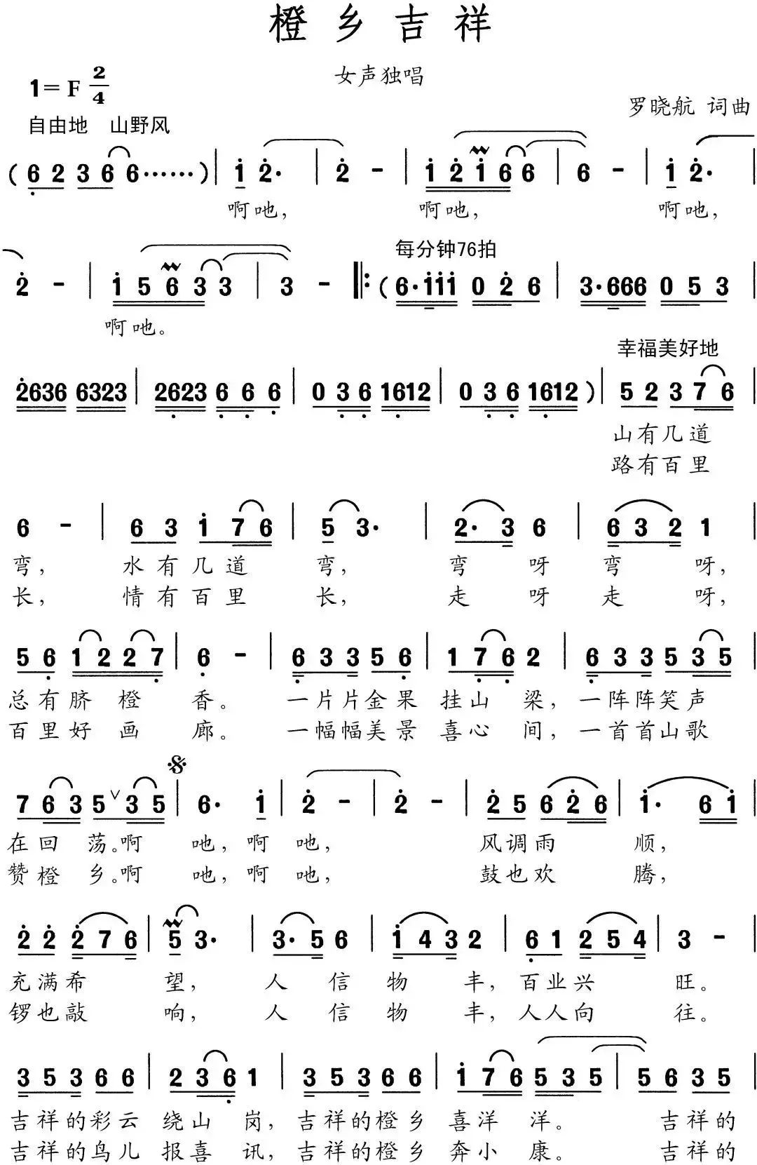 《橙乡吉祥》赞颂了这美丽的风景线、亮丽的生态带、壮丽的经济廊。描绘了橙乡人民满怀豪情奔小康的火热生活。歌词情真意切、清雅自然,曲调优美动听,富有浓郁的民歌风。