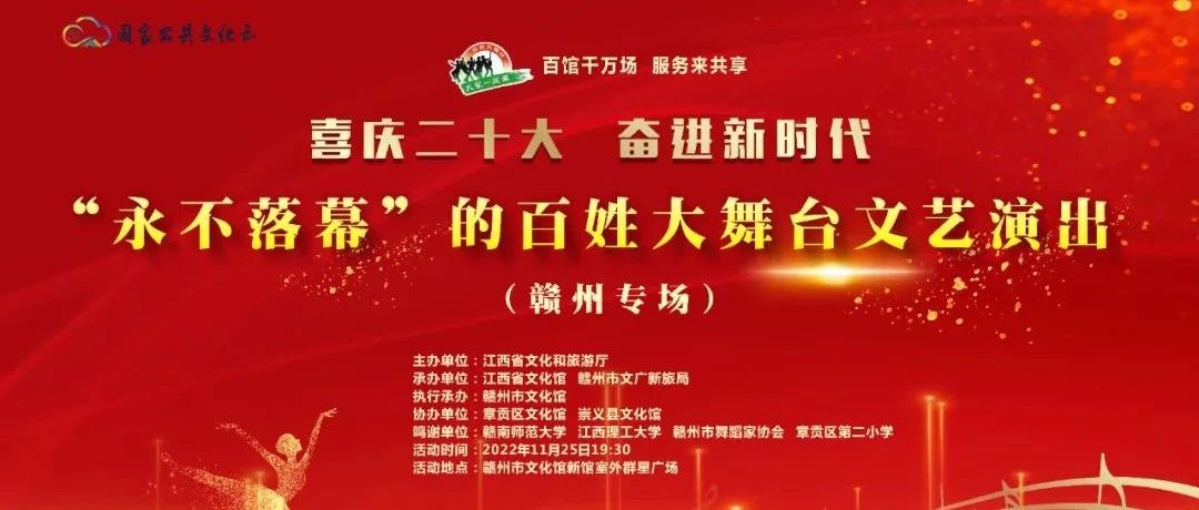 2022年11月25日19:30,由江西省文化和旅游厅主办,江西省文化馆、赣州市文广新旅局承办,赣州市文化馆执行承办的喜庆二十大•奋进新时代“永不落幕”的百姓大舞台文艺演出(赣州专场)活动将在赣州市文化馆(新馆)室外群星广场上演。国家公共文化云将进行全程直播,欢迎收看!