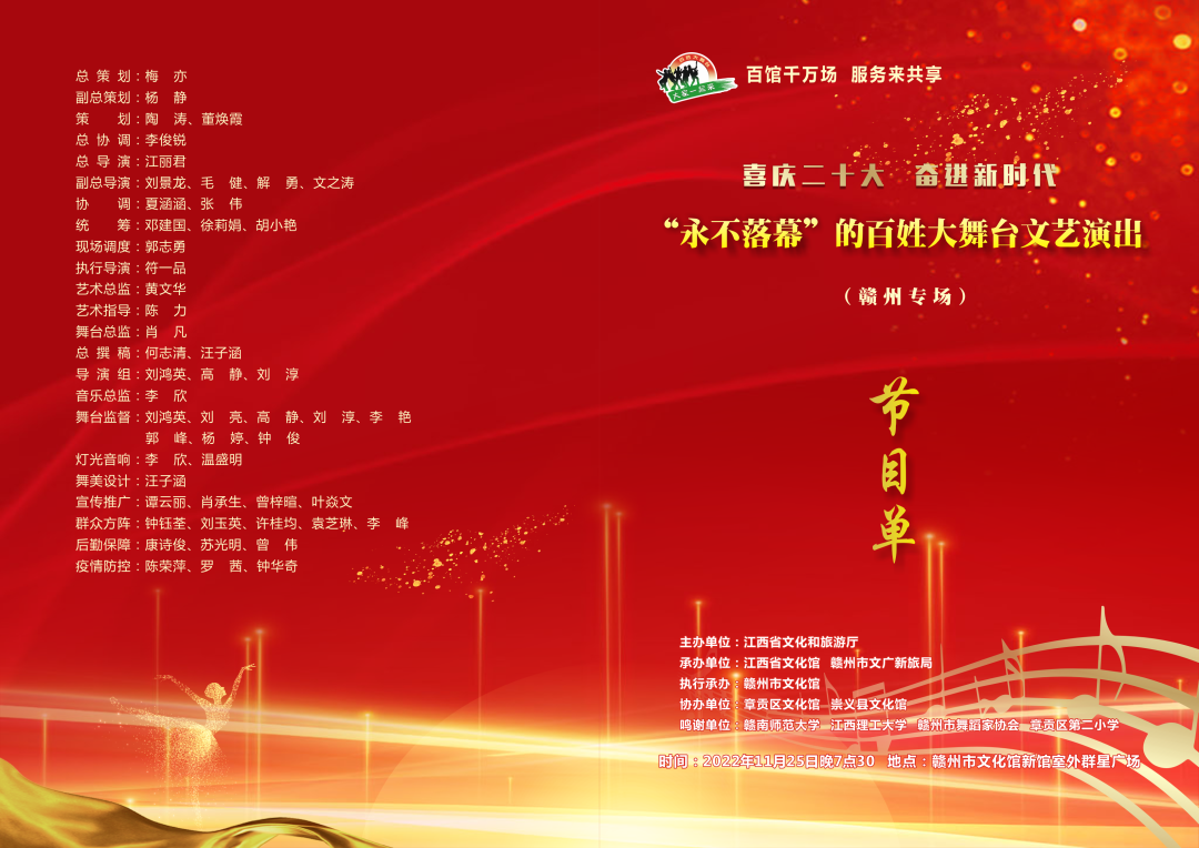 11月25日晚,由江西省文化和旅游厅主办,江西省文化馆、赣州市文广新旅局承办,赣州市文化馆执行承办的喜庆二十大•奋进新时代“永不落幕”的百姓大舞台文艺演出(赣州专场)活动在赣州市文化馆(新馆)室外群星广场成功举办。此次活动由国家公共文化云平台进行现场直播。