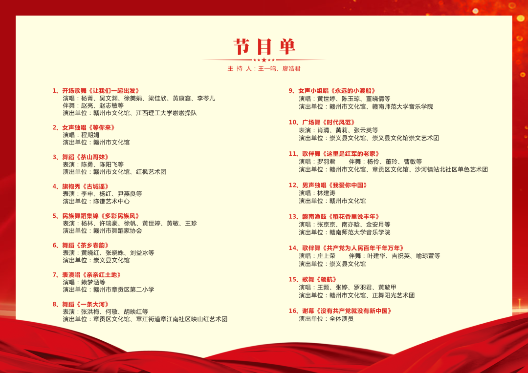 整场演出恢弘热烈、鼓舞人心,《让我们一起出发》《等你来》《这里是红军的老家》等赣州本地群文工作者原创歌舞节目,以及舞蹈《茶山哥妹》、舞蹈《茶乡春韵》、赣南渔鼓《稻花香里说丰年》等独具赣南地域文化特色和赣南人文气息的节目轮番登台展演,演员们用灵动的舞姿、真情的歌唱,抒发了赣州市广大群众对祖国的无限热爱与美好祝福,为观众献上了一场舞台气象新、艺术水平高的精彩文艺演出。