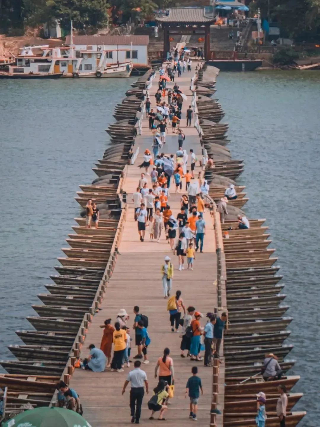 赣州古浮桥,学名叫惠民桥,又称东津桥、东河浮桥。浮桥长约400米,由100多只小舟板并束之以缆绳相联而成,始建于宋乾道年间(1163——1173)、至今已有800多年历史。由知军洪迈所建,连接章江的两端,每天定时开启,以便来往商船通行。赣州市三面环水,江面宽阔。在宋代先后建造铺就了东河、西河、南河三座浮桥以沟通城乡。建国以后,西河、南河浮桥因修建了公路大桥而被折除,东河浮桥就成了现今赣州市的“国宝”级文物。整座浮桥分为33组,用缆绳把它们连接起来,然后用钢缆、铁锚固定在江面之上。