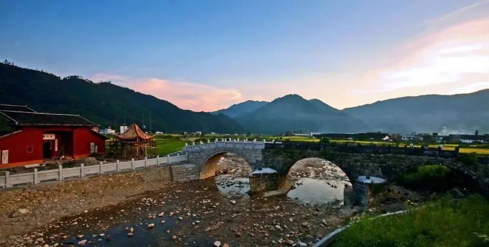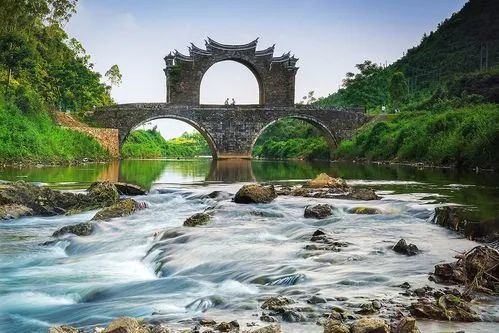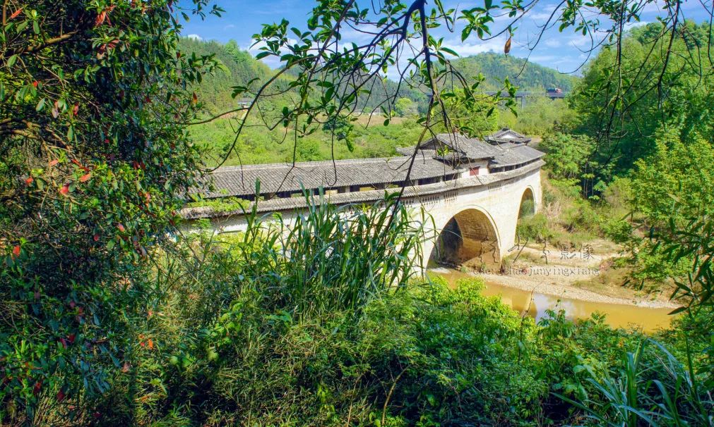 信丰玉带桥位于距信丰县城40公里处。横跨于虎山河上,因其弧形如玉带飞跨于崇山峻岭之间,凌架于滔滔激流之上,故名玉带桥。屋面为悬山式,陶瓦垫沟,青瓦覆顶,另在南、北西端和中间各建砖木结构的九脊翘角堡亭一间。玉带桥为当地富翁余风歧募资建于清乾隆五年(公元1740年),故又名“风歧桥”。玉带桥为二墩三孔屋楼式拱桥,桥身成弧行,桥长88.15米,是江南现存最长的弧形廊桥,它以结构独特,气势雄伟而闻名赣粤。留下了“远近闻名玉带桥,两岸峻峰入云霄。奔腾河水泻千里,玉带飞镇两山腰”的赞誉。现为全国重点文物保护单位,赣南六大古廊桥之一。