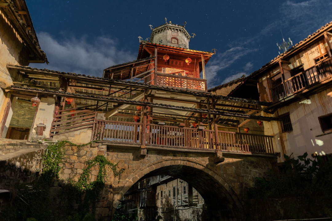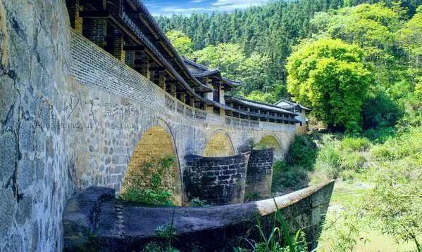 永安桥位于南康区坪市乡莲花河上,始建于清光绪年间(1875—1909)。当地村民习惯称之为“暗桥”,其实它真正的名字叫作“永安桥”。据《钟氏族谱》记载,是取“永以为好,既安且吉”的意思。永安桥属于罕见的石木结构叠梁式廊桥,跨度约13.2米,宽约4米。桥墩为船形,前尖后方,它和桥身均用数十根长短不一的麻石条构建而成。在桥身上面,盖有走廊式的楼阁,两侧则架着简易的木凳和护栏,并均匀地竖着4根方形石柱。整座古桥坚固耐用,至今仍起着供村民们通行和小憩的作用。