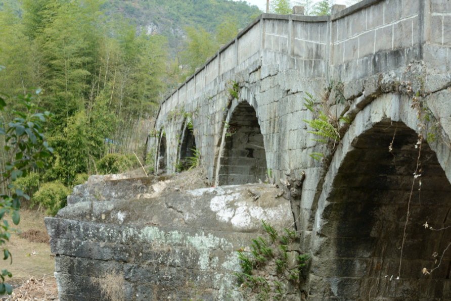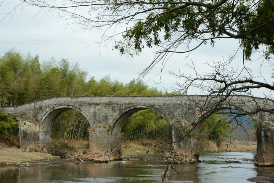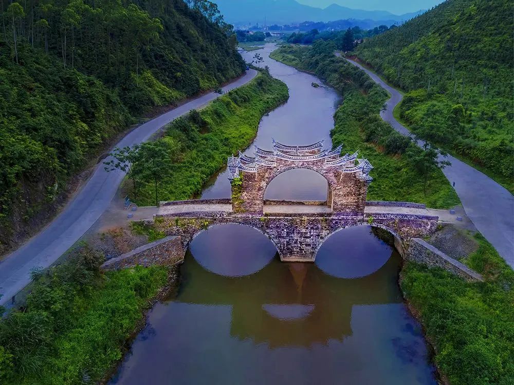 永安桥位于章贡区水西镇永安村,横跨永安溪上,建于清代,是一座大型单孔石拱桥,桥长12.1米,宽3.68 米,高5.35 米。永安桥的来历与永安桥边的真君庙息息相关。永安溪畔的真君庙,周围古木参天,庙内曾供真君像,并有戏台和厢房。早年苦于宽长的永安溪阻隔,村民进庙祈求多有不便,永安村人便在真君庙后、永安溪上建了永安桥。永安桥的建成,既便民又为庙增色。如今,永安桥两岸翠竹摇曳,竹荫蔽日,桥下永安溪水日夜不停汩汩缓流。