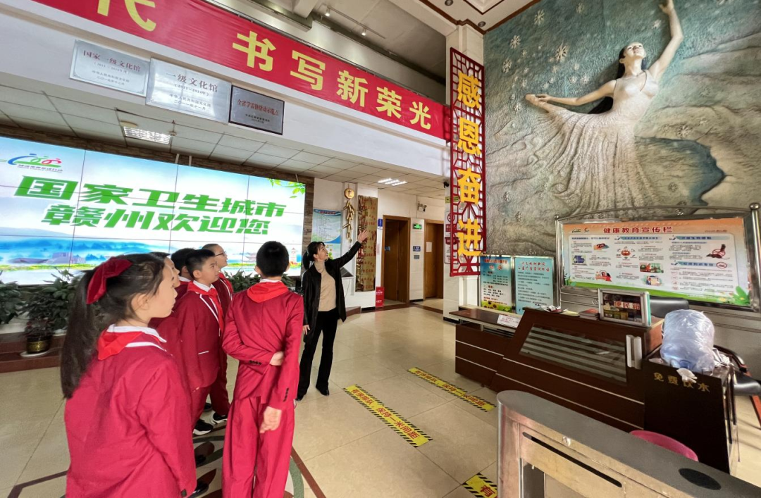 在赣州市文化馆内,学生们聆听了赣州市文化馆的发展史,详细了解了赣州市文化馆为丰富群众精神文化生活所开展的艺术普及和文化惠民活动;并参观了馆内四楼非遗展厅,学习非物质文化遗产知识。