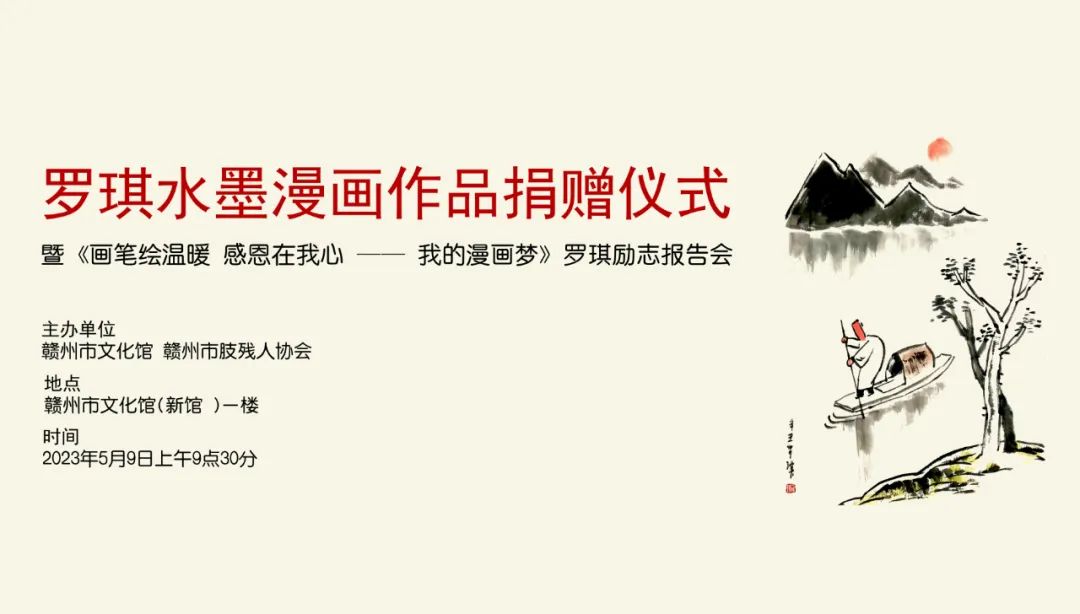 为弘扬“人道、博爱、奉献”的红十字精神,迎接“第三十三次全国助残日”,5月9日上午,由赣州市文化馆、赣州市肢残人协会主办的罗琪水墨漫画作品捐赠仪式暨《画笔绘温暖 感恩在我心——我的漫画梦》罗琪励志报告会在赣州市文化馆新馆举行。市文广新旅局二级调研员张伟、市公共文化服务中心负责人(市图书馆馆长)刘小灵出席此次活动,赣州市文化馆、赣州市文化志愿者、赣州市肢残人协会会员代表等80余人参加了此次活动。
