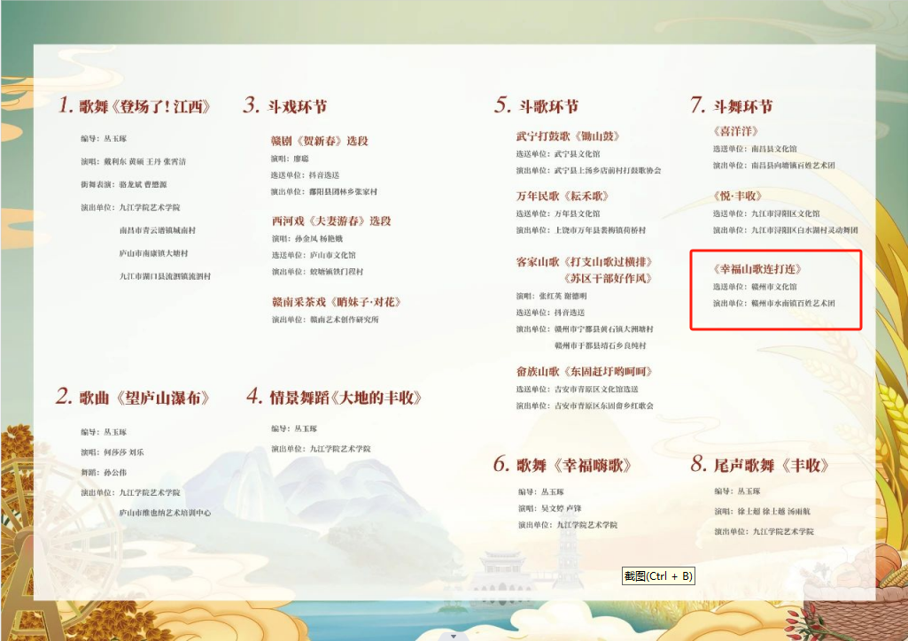 赣州市文化馆《幸福山歌连打连》舞蹈队的全体演员以饱满的热情、良好的精神风貌,全身心投入到节目的表演中,在《幸福山歌连打连》的歌声中唱出了丰收的喜悦,舞出了农民们对美好幸福生活的向往,生动展现出江西全面推进乡村振兴取得的丰硕成果。